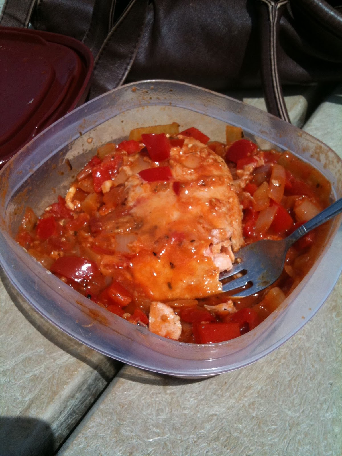 Anyway, I hard boiled three eggs for breakfast. Nothing fancy but it gets the job done. I chopped up half a red pepper, half an onion and a roma tomato and sauteed in butter. I threw a piece of salmon in a pot of hot water and turned it on to boil. I added organic marinara to the satueed veggies and put them in BPA free tupperware. I topped with grated raw cheese and when the salmon was poached through, threw that on top of the veggies.